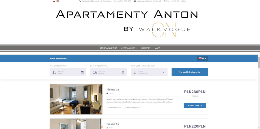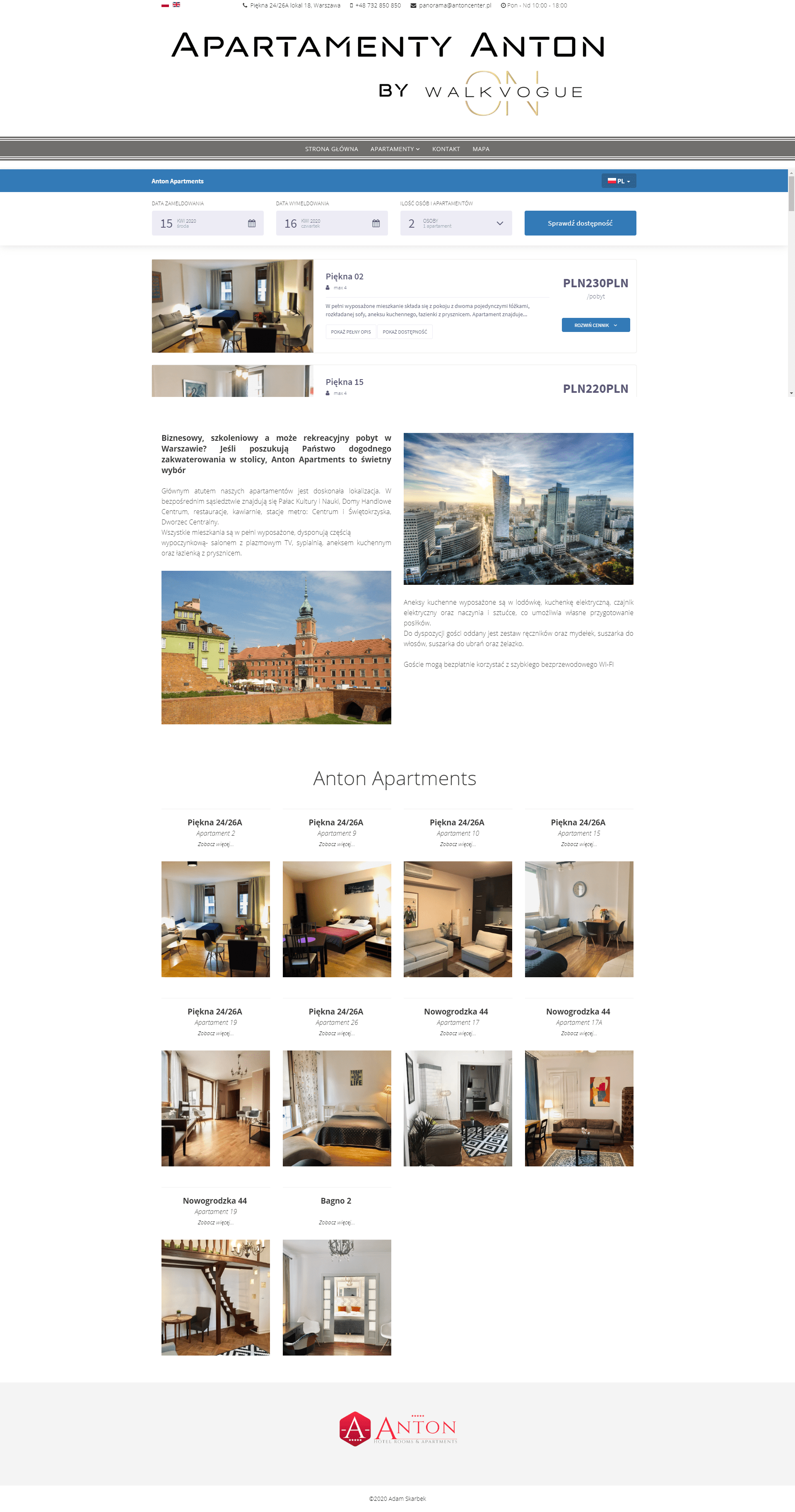 Serwis stanowił rozbudowany serwis dla właściciela licznych apartamentów w centrum Warszawy, zapewniając wgląd w dostępne oferty i ułatwiając proces rezerwacji. Strona została połączona z zewnętrznym portalem zarządzającym rezerwacjami online, co usprawniło obsługę klientów i automatyzację rozliczeń.