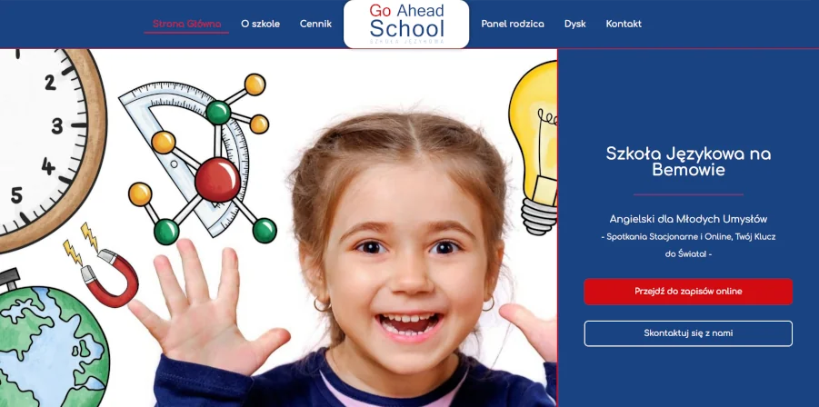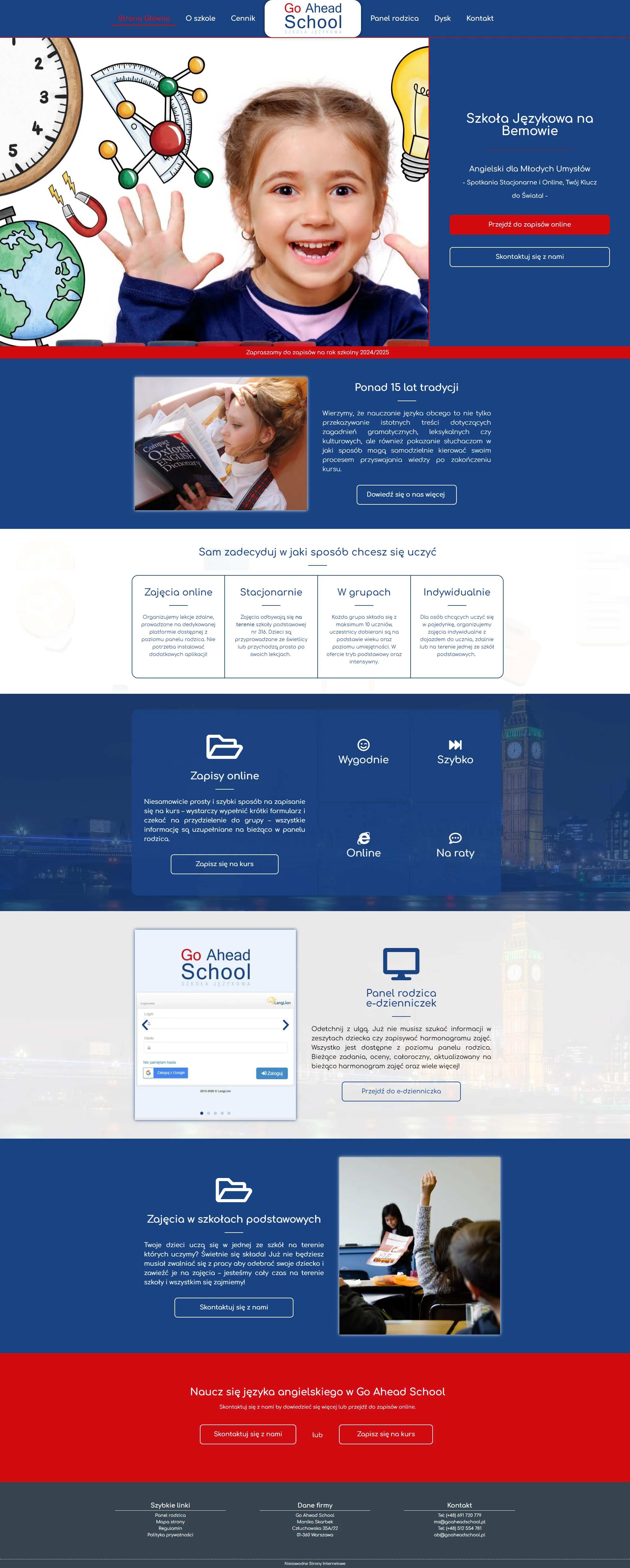 Go Ahead School doczekała się już trzeciej wersji witryny, stworzonej na bazie rosnących potrzeb szkoły językowej i stale rozszerzanej oferty kursów. Starannie opracowany układ treści ułatwia znalezienie odpowiedniego programu nauczania i szybką rezerwację miejsc.