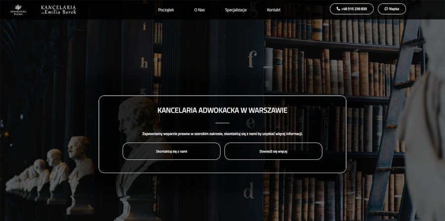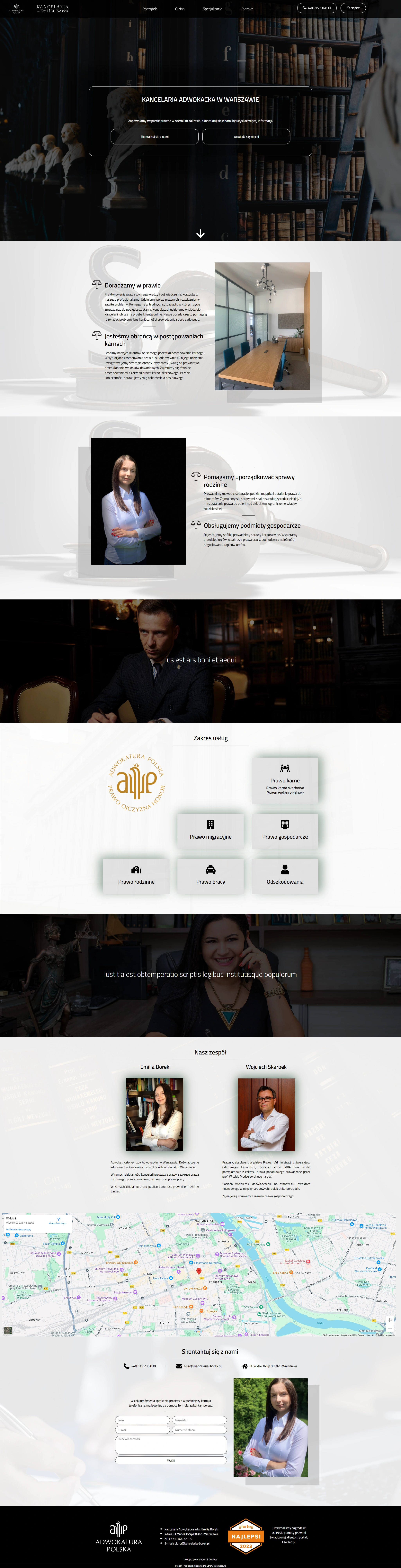 Strona jest kolejną realizacją przygotowaną dla tego samego klienta, reprezentującą usługi prawnicze w przejrzysty, a zarazem profesjonalny sposób. Jasna struktura pomaga szybko odnaleźć kluczowe informacje, podkreślając wiarygodność kancelarii adwokackiej.