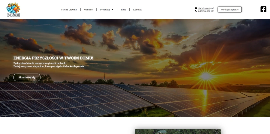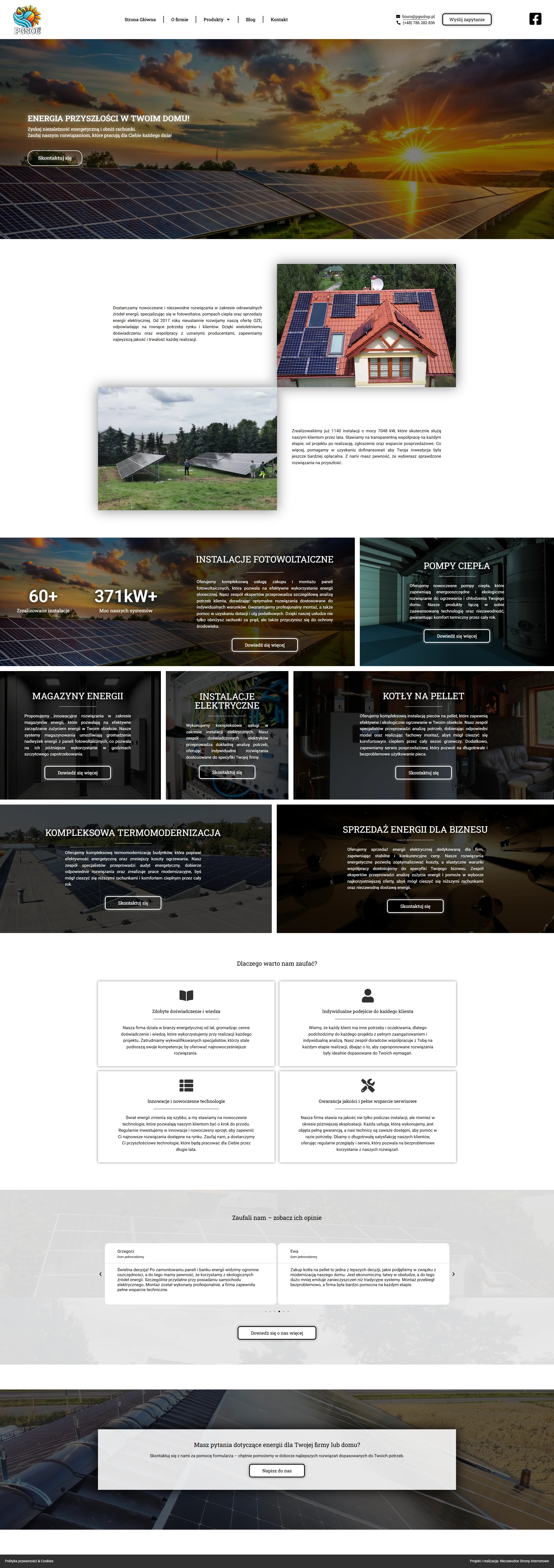 Projekt charakteryzuje się przejrzystym układem i nowoczesną oprawą graficzną, co sprzyja przyjaznej interakcji z użytkownikiem. Dzięki dobrze zaprojektowanej strukturze witryna wspiera klientów w podejmowaniu świadomych decyzji, a jednocześnie wzmacnia wizerunek marki jako eksperta w branży energii odnawialnej.